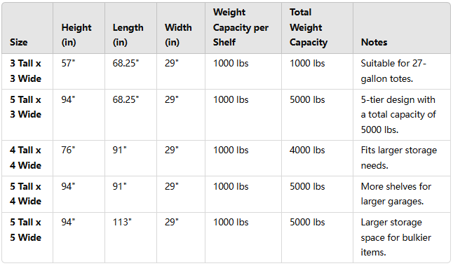 • 1000 lbs per shelf, ensuring safe storage even for heavier items.