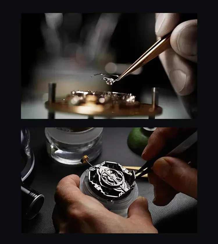 The small, thin rose gold dial shines with a soft light, changing the dreamlike color.