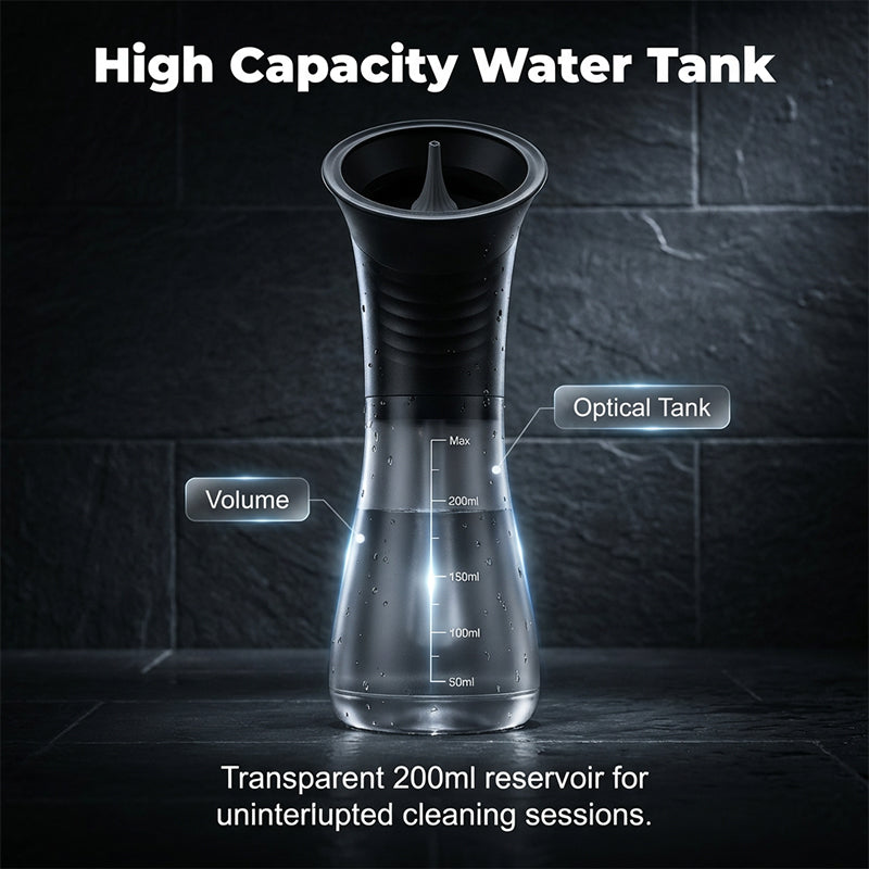 LARGE DUAL-TANK SYSTEM - Features separate 230ml tanks for clean and dirty water. This design ensures a hygienic, uninterrupted cleaning session without the need to stop and refill, providing ultimate convenience and cleanliness.