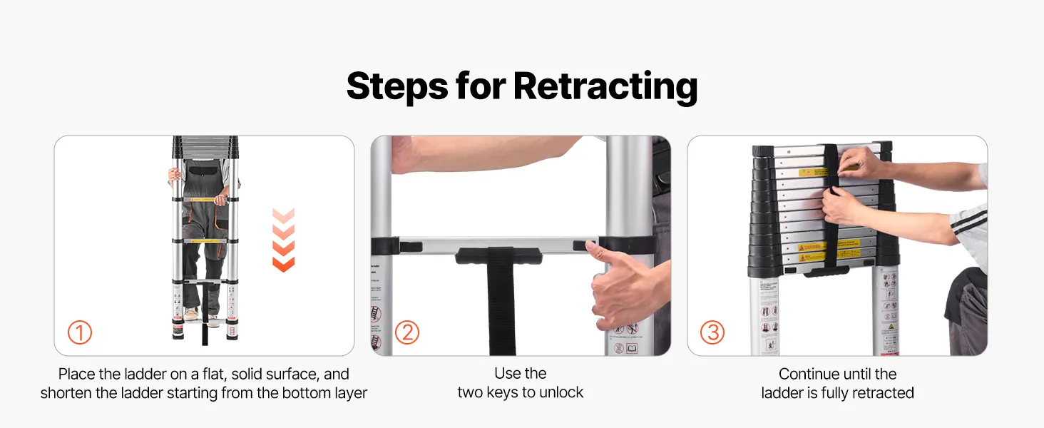 • One-Button Retraction: This collapsible ladder features individual locking switches on each step, making it easy to adjust to your desired height. The one-touch model extends from the bottom to the desired height, with unused sections stacked at the top