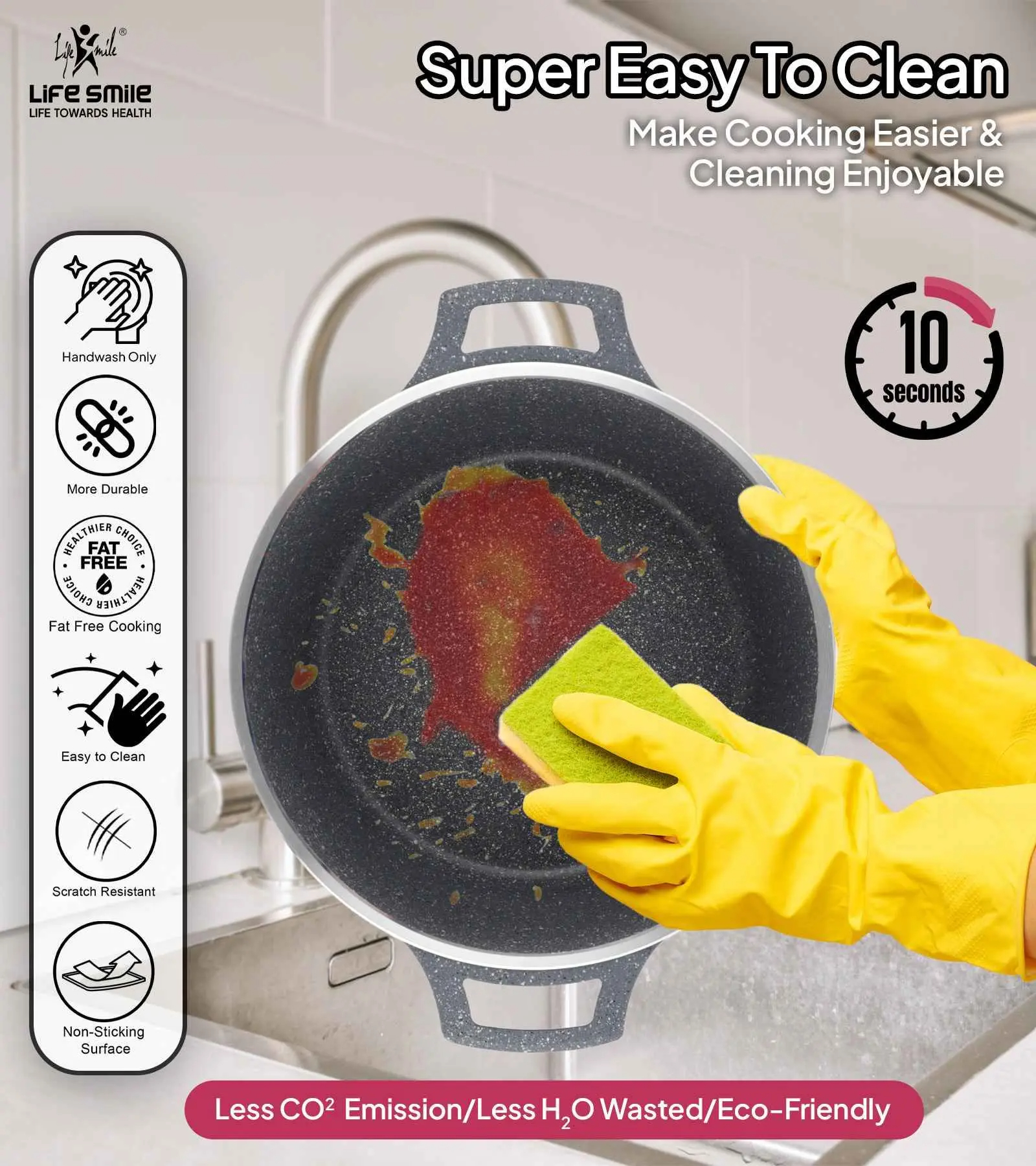 Granite Non-Stick Coating: Making It Easy To Clean And Minimizes Chances Of Food Sticking To The Surface. The Coating Shall Make It More Durable And You Will No Longer Have To Worry About Any Staining Or Permanent Residues. The Non-Stick Surface Will Allow You To Cook With a Minimum Amount Of Butters/Oils/Fats, Making Food Much Healthier.