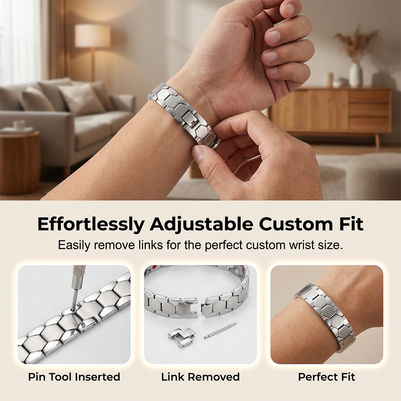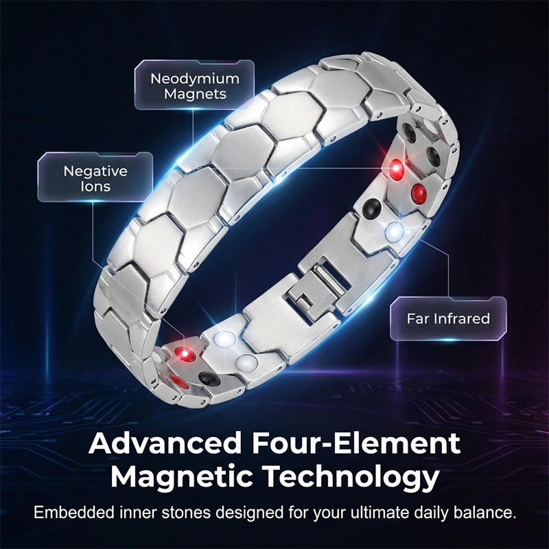 ADVANCED FOUR-ELEMENT MAGNETIC TECHNOLOGY - The inner band features strategically placed magnetic, germanium, far-infrared, and negative ion stones. Experience a sophisticated accessory designed to complement your active and balanced lifestyle.