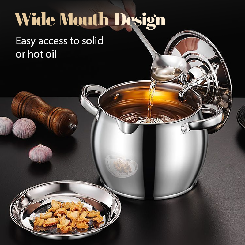 VERSATILE HANDLE & SPOUT DESIGN: Stable handles and drip-free pouring Ergonomic side handles offer a firm grip, even with hot oil. The smart spout design allows for precise, spill-free pouring. The lid also hooks onto the rim, keeping your countertop clean and your workspace organized.
